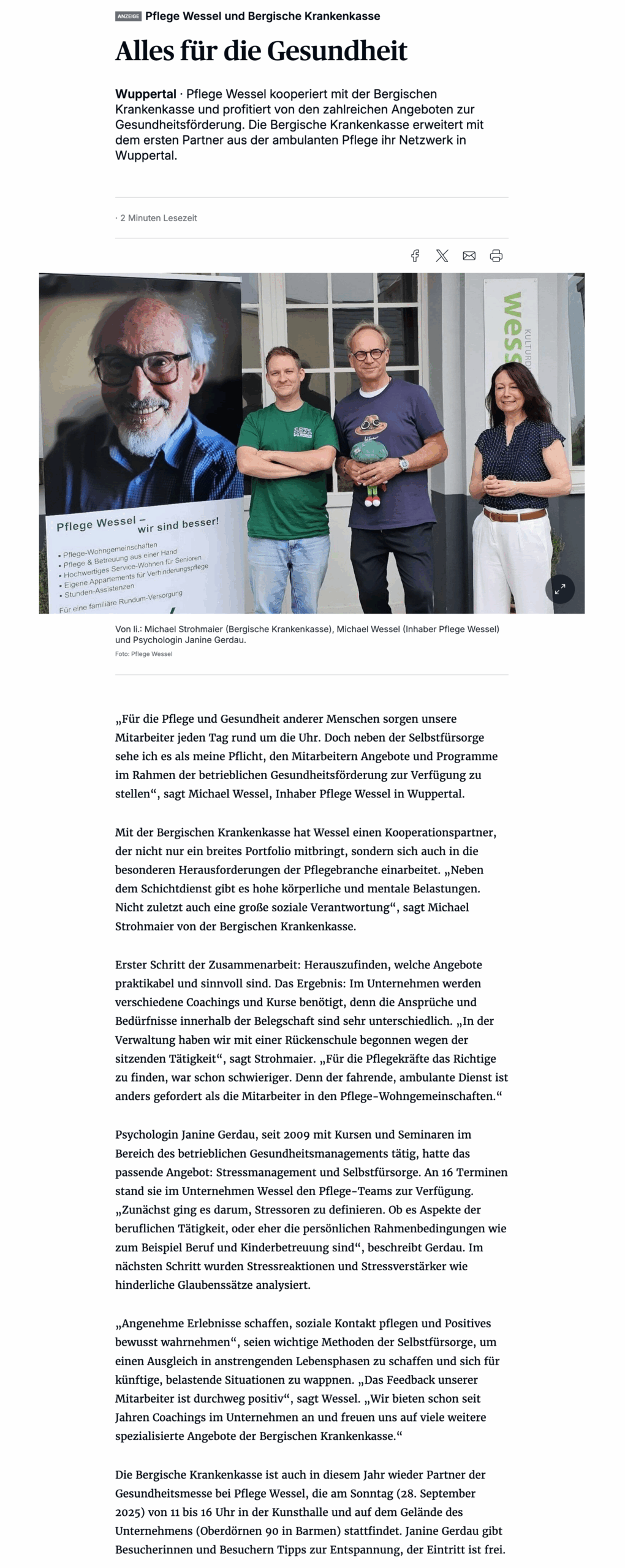 Pflege Wessel kooperiert mit der Bergischen Krankenkasse