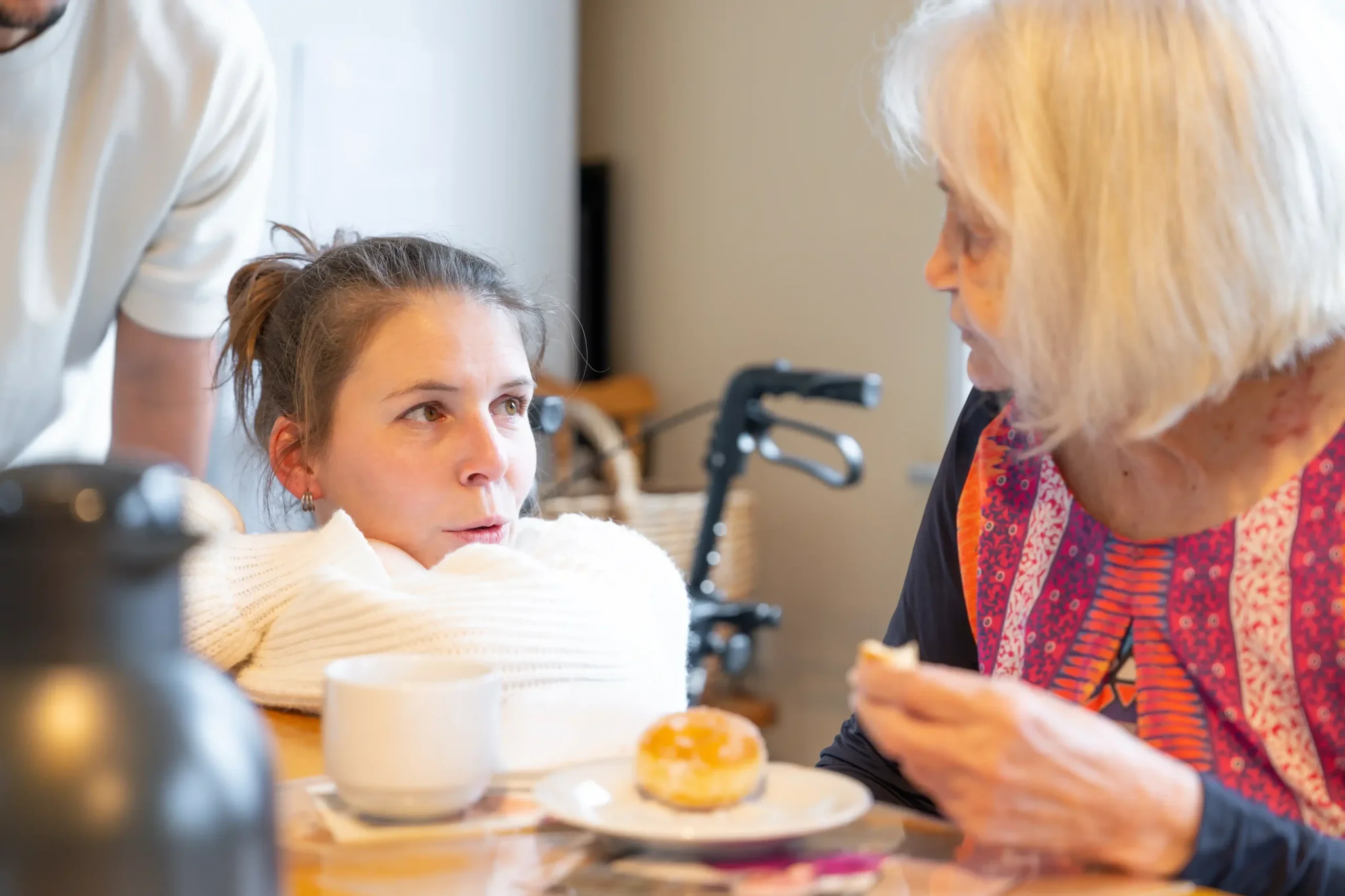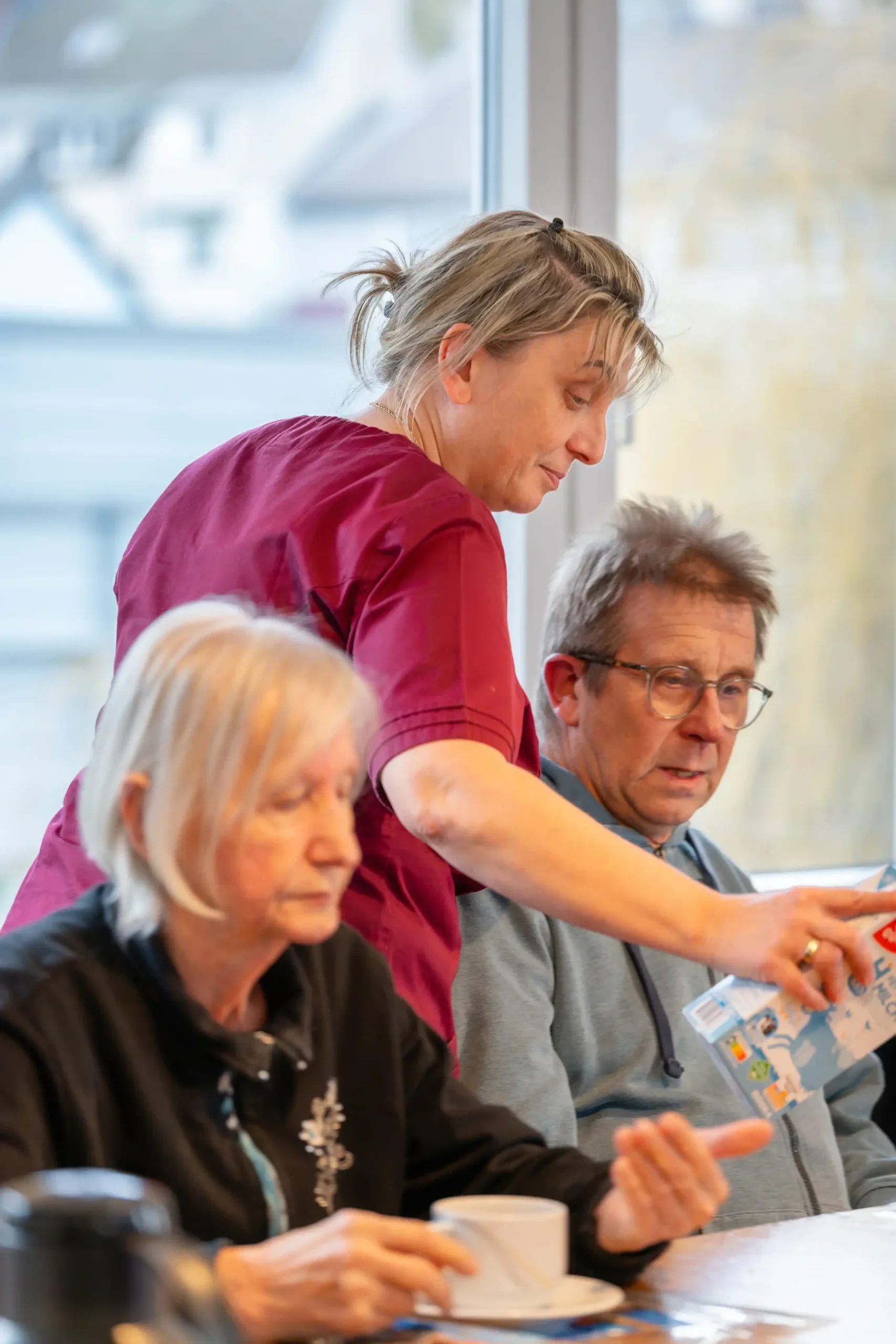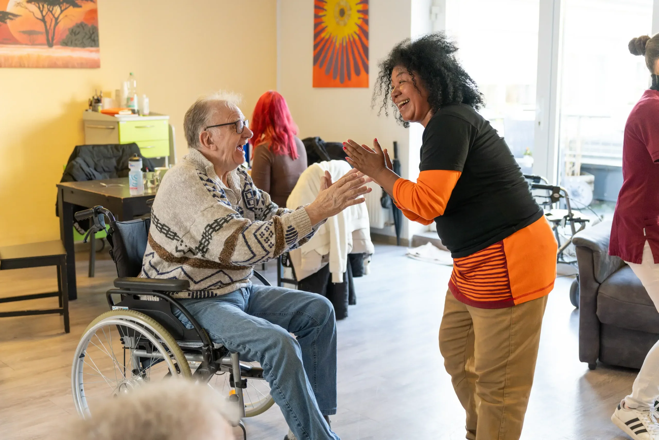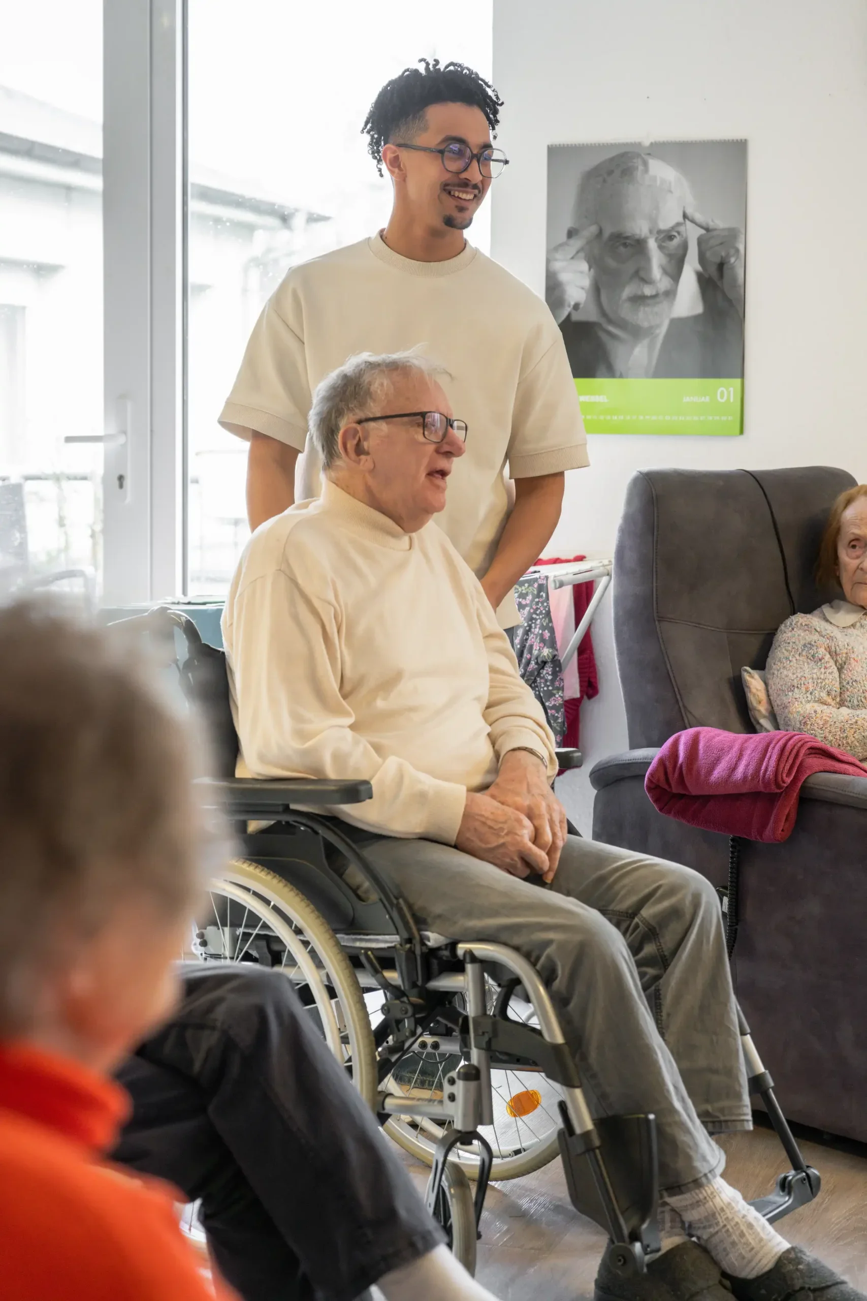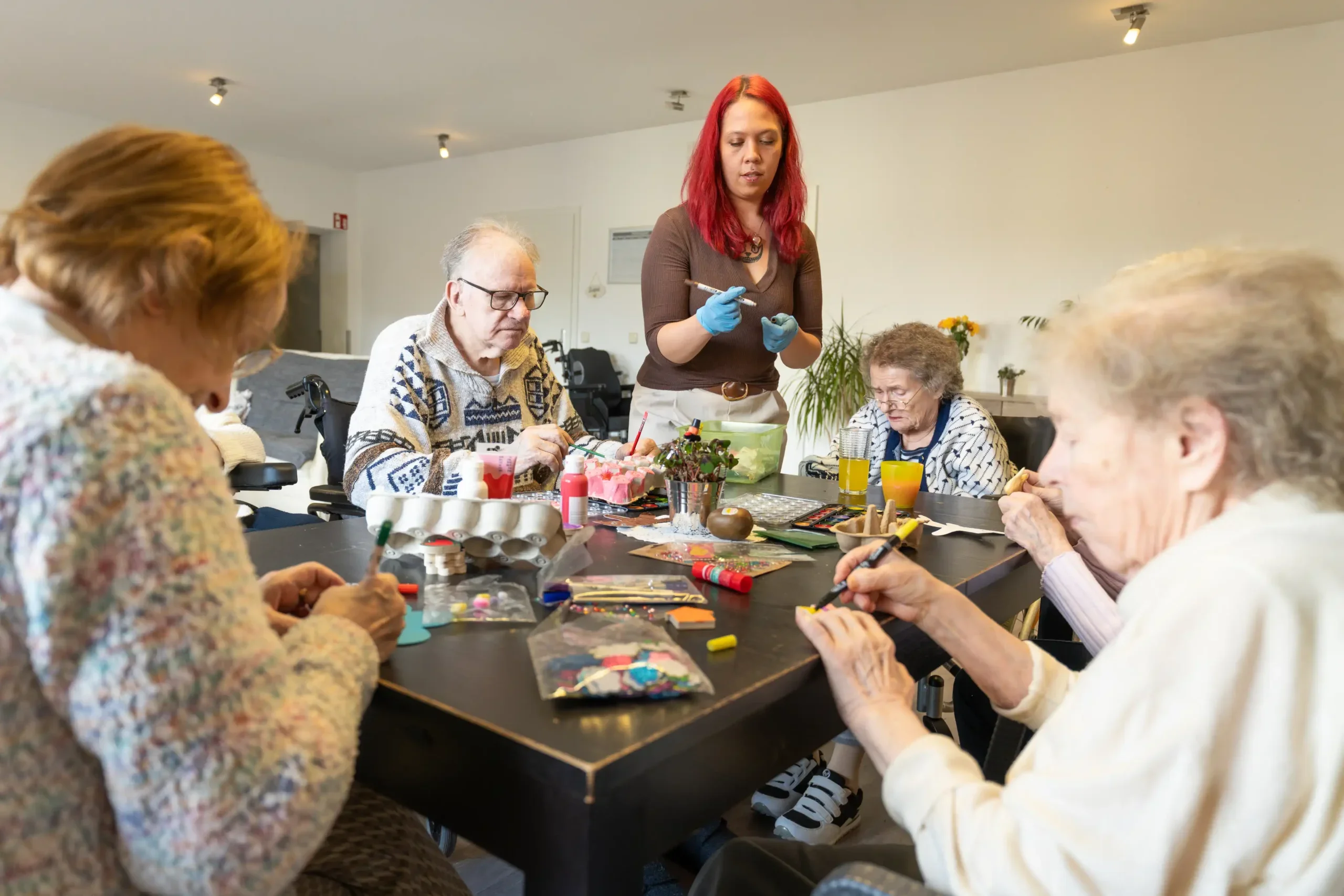Das Miteinander prägt den Alltag: gemeinsame Mahlzeiten, Spiele, Musik und Mobilisationsübungen. Die Gemeinschaftsräume sind zentrale Treffpunkte, wo Bewohner auch bei kleinen Aufgaben wie Tischdecken oder Wäschefalten mithelfen können.